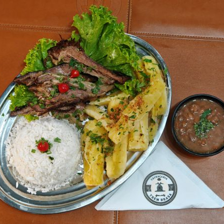 Delicioso cupim casqueirado acompanha arroz, feijão e fritas.