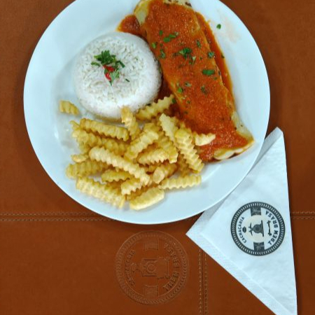 Delicioso ancho à parmegiana preparado com nosso molho caseiro acompanha arroz e fritas.