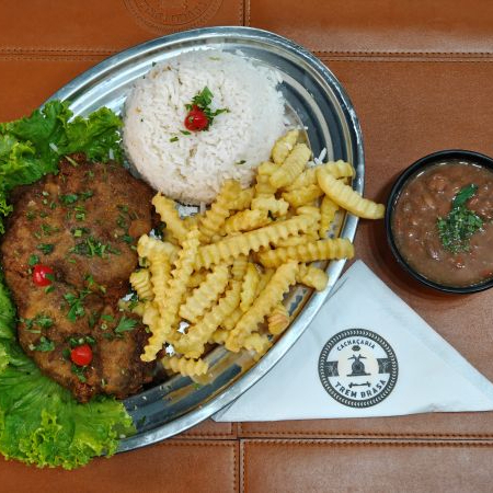 Suculento filé mignon à milanesa acompanha arroz, feijão e fritas.