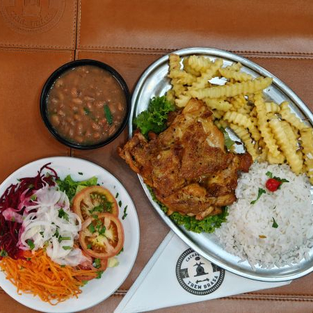 Delicioso file de coxa com sobrecoxa acompanhado de arroz, feijão, fritas e salada