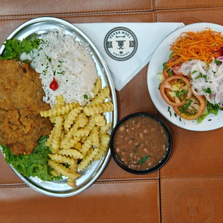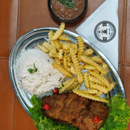 Delicioso ancho à milanesa acompanha arroz, feijão, fritas, salada.