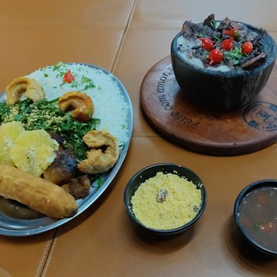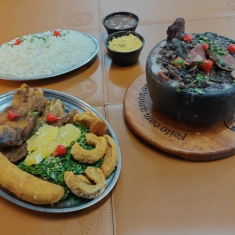 Deciliosa feijoada grande acompanhada de arroz, couve, bisteca, torresmo, banana e laranja e nosso suculento joelho de porco.
