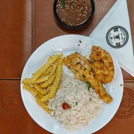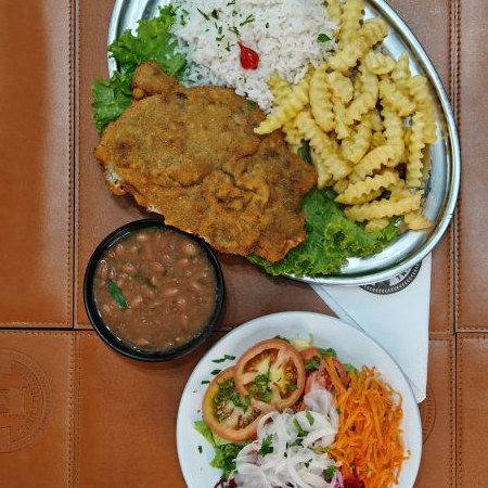 Delicioso filé de frango, acompanha arroz, feijão, fritas, salada.