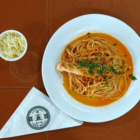 Espaguete com delicioso molho caseiro acompanha filé de frango grelhado.