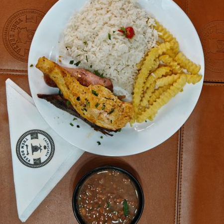 Delicioso ancho acompanha arroz, feijão, fritas, salada.