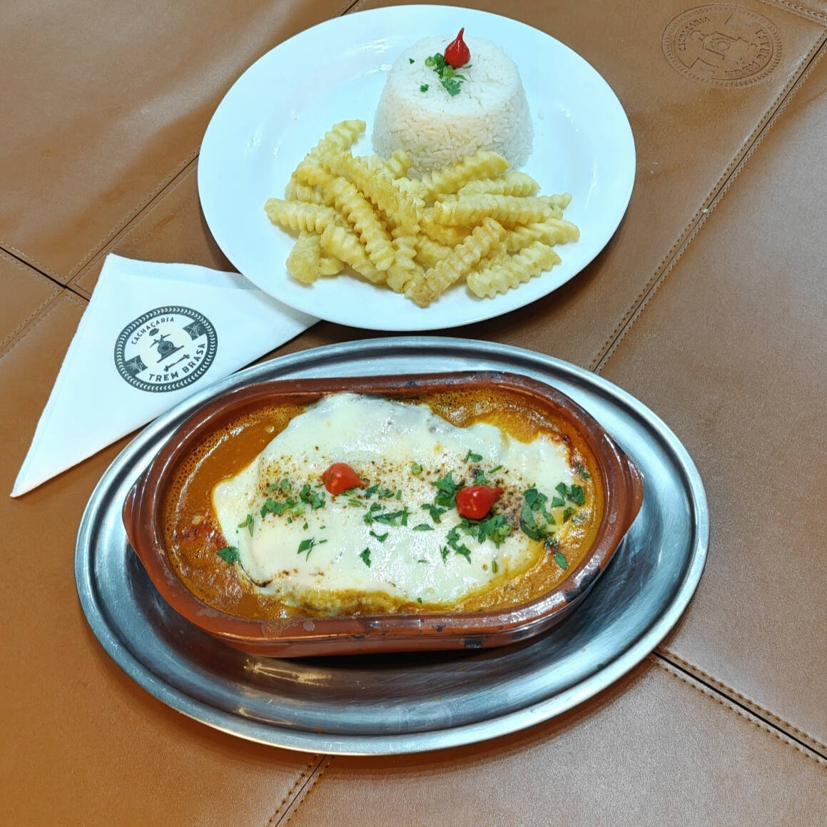 Delicioso frango à parmegiana com molho caseiro acompanha arroz e fritas.