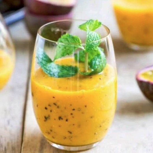 A manga é rica em vitaminas A, C e do complexo B, além de minerais como cálcio, potássio, ferro, magnésio e fósforo, melhorando a constipação e o funcionamento gastrointestinal. O maracujá é baixo em calorias e possui alto poder antioxidante e imunológico, graças às vitaminas C e A, além de minerais e fibras. Serve 2 pessoas