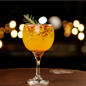 Deliciosa caipirinha feita com polpa de maracujá, cachaça, xarope de açúcar e gelo.