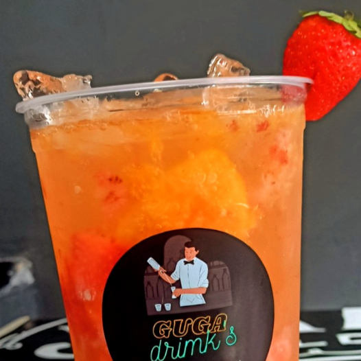 Nosso copão vai com, gin + energético de pêssego, gelo de morango