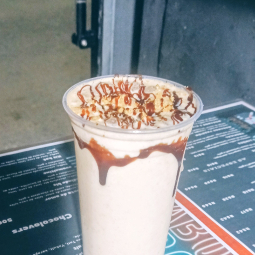 Deliciosa batida feita com, conhaque, leite condensado, creme de leite, essência de baunilha, chocolate, leite integral, calda de chocolate e gelo.