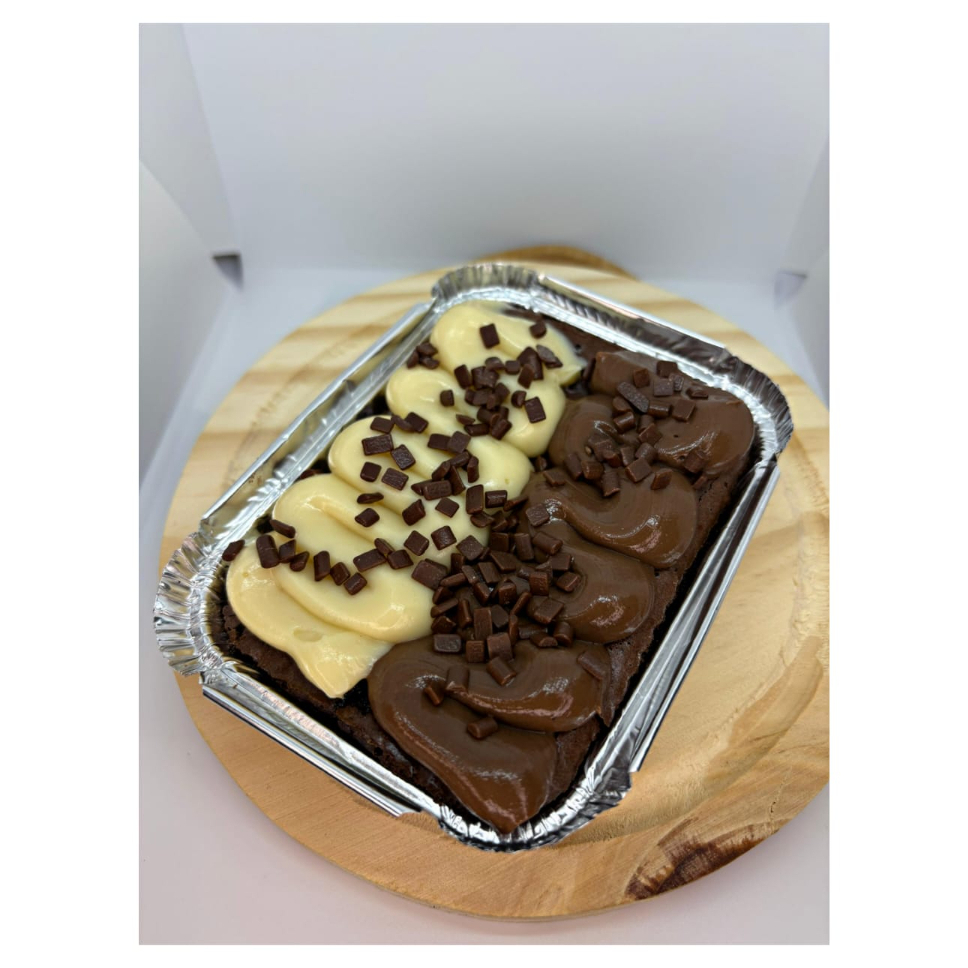 Delicioso brownie dueto com gotas de chocolate, preenchido com delicioso creme de Ninho e um creme de chocolate 50% cacau finalizado nos granulados uma delícia para quem gosta de doce