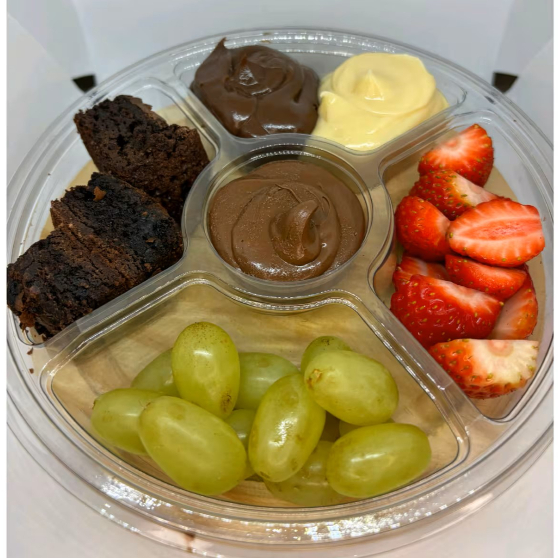 "Uma experiência irresistível em cada mordida: nossa petisqueira foi pensada para os amantes de sabores marcantes. Nela, morangos frescos, uvas suculentas e pedaços de brownie se unem aos nossos cremosos e exclusivos recheios — creme de chocolate 50% cacau e creme de leite Ninho. No centro, o destaque especial: uma generosa porção de Nutella, que traz o toque final de indulgência. Perfeita para compartilhar (ou saborear sozinho)!"