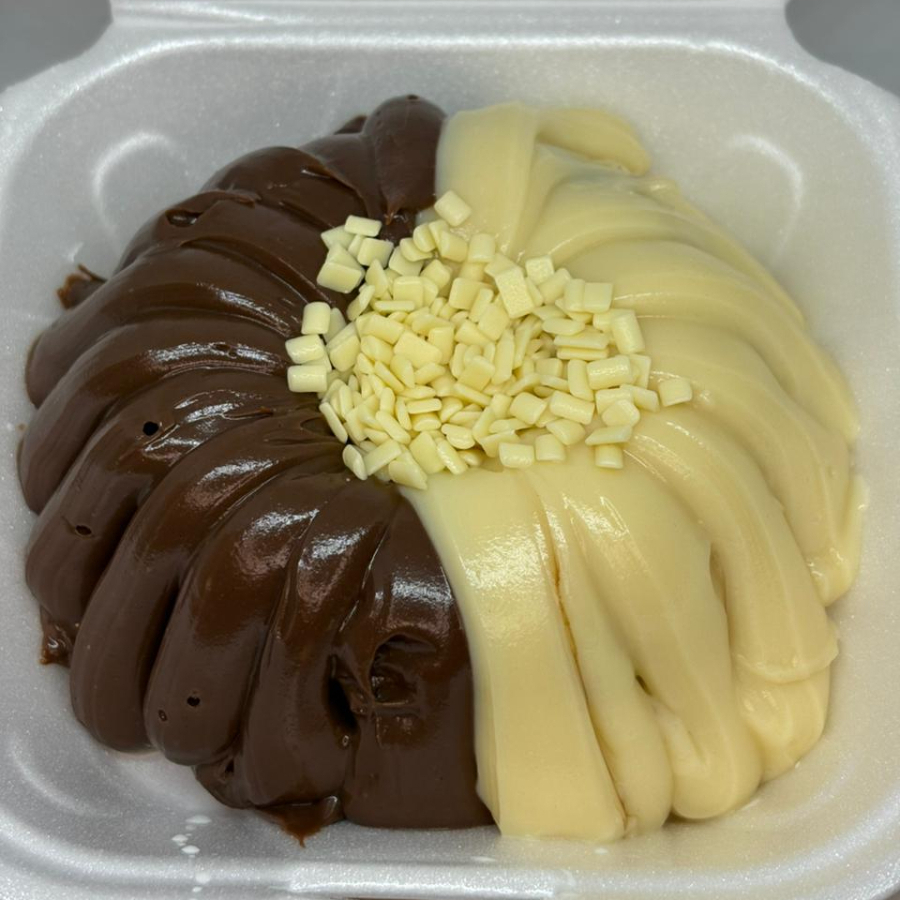 "Mini Vulcão Duo – Uma combinação perfeita para os indecisos por amor! Bolo de chocolate com massa úmida e macia, coberto por uma generosa camada dupla: metade com nosso cremoso creme 50% cacau, e a outra metade com o suave e delicado creme de Ninho. Para finalizar, um toque especial de granulados nobre de chocolate branco que trazem crocância e elegância à sobremesa. Um vulcão que transborda sabor!"