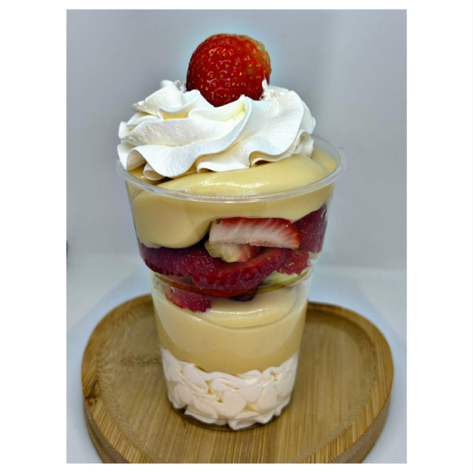 Copo Merengue de Morango Uma sofisticada sobremesa em camadas, que combina o sabor delicado do creme de leite Ninho, a leveza do chantilly artesanal e a suculência dos morangos frescos selecionados. Um equilíbrio perfeito entre doçura, frescor e cremosidade para encantar o paladar.