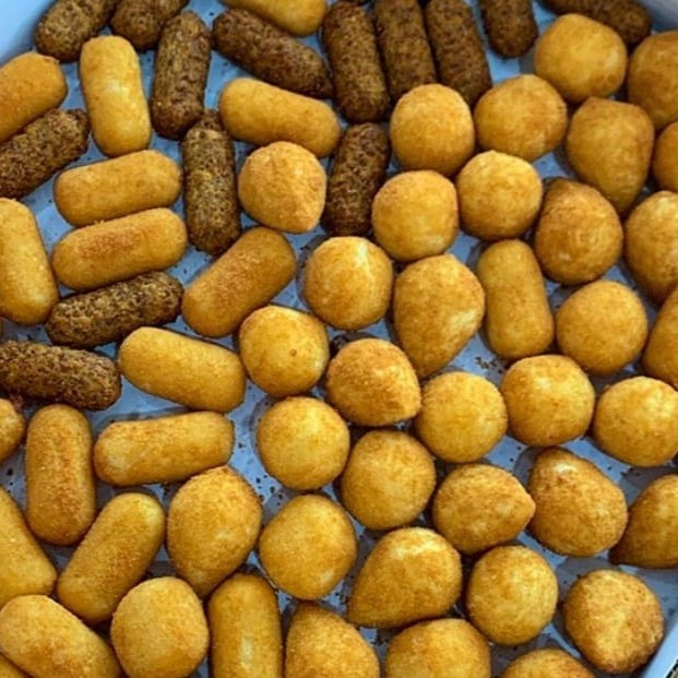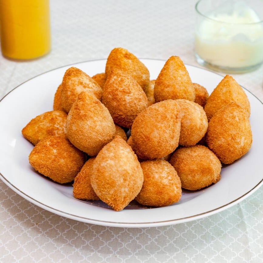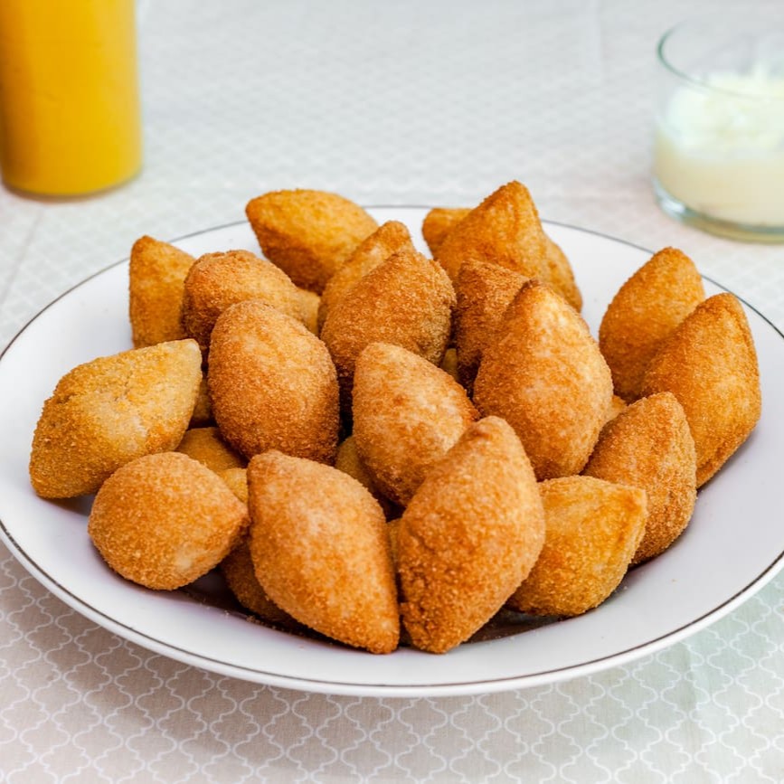 Caixa com 50 mini coxinhas de frango + 50 bolinhos de queijo, fritos, sequinhos e cheios de sabor.