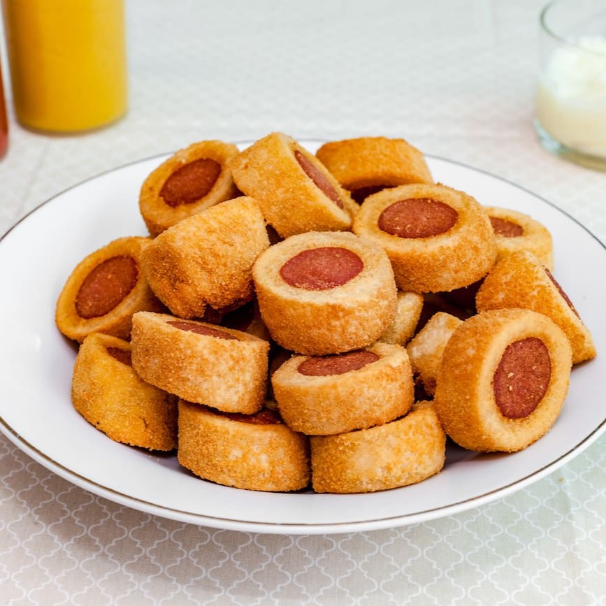 Enroladinho de salsicha frito com massa macia, salsicha suculenta e fritura dourada e sequinha. Um clássico das festas que agrada crianças.