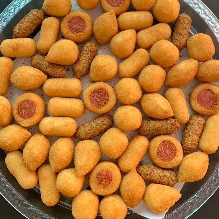 Coxinha, bolinho de queijo, bolinho de calabresa c/ queijo, bolinho de presunto c/ queijo, bolinho de carne, kibe e enroladinho de salsicha