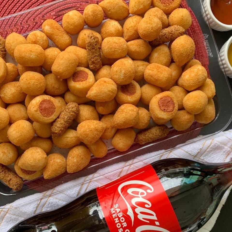 40 salgados com os seus sabores preferidos, fritos na hora + 20 mini churros de doce de leite + 1Refrigerante de 1L geladinho!