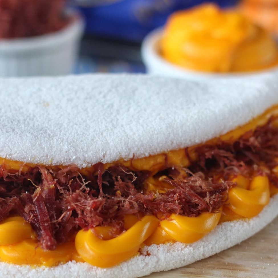 Uma combinação irresistível! Nossa massa de tapioca levinha e crocante abraça um recheio generoso de Carne seca desfiada, envolvida na cremosidade da muçarela derretida. Uma explosão de sabor caseiro em cada mordida!