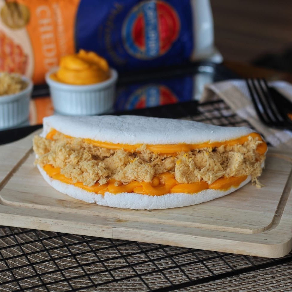Frango desfiado temperadinho com cheddar cremoso Catupiry Original, na nossa tapioca leve e fresquinha. Sabor que conquista!