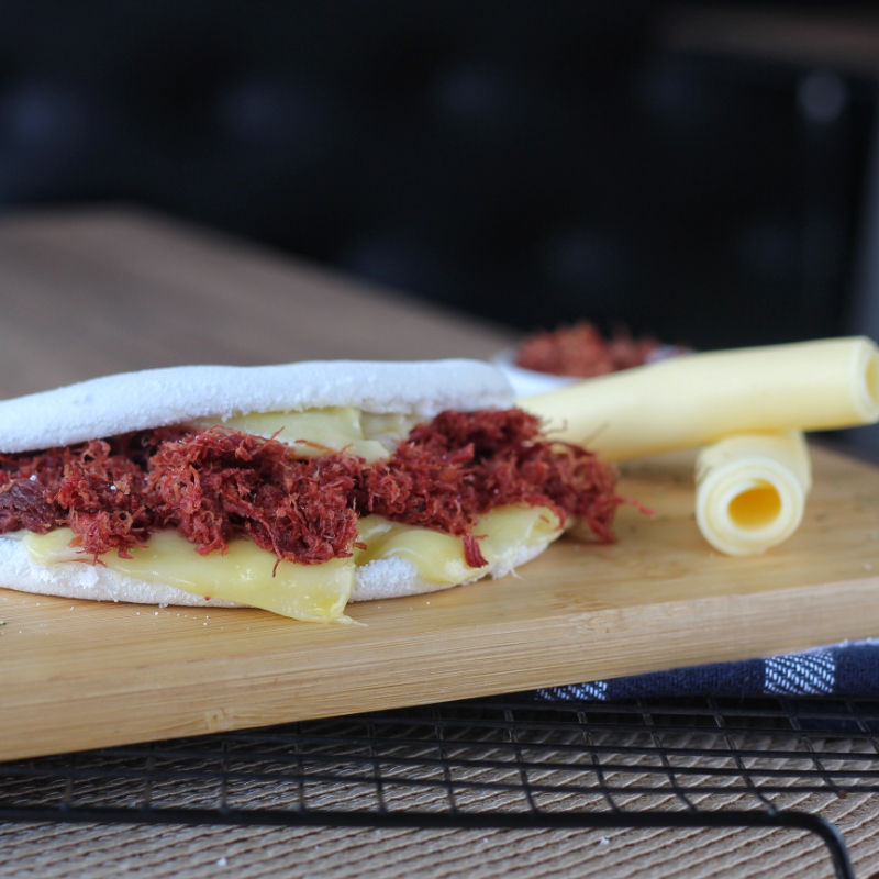 Uma combinação irresistível! Nossa massa de tapioca levinha e crocante abraça um recheio generoso de Carne seca desfiada, envolvida na cremosidade da muçarela derretida. Uma explosão de sabor caseiro em cada mordida!