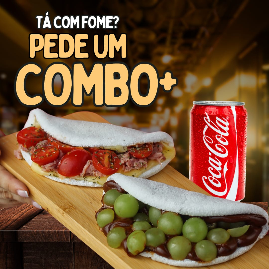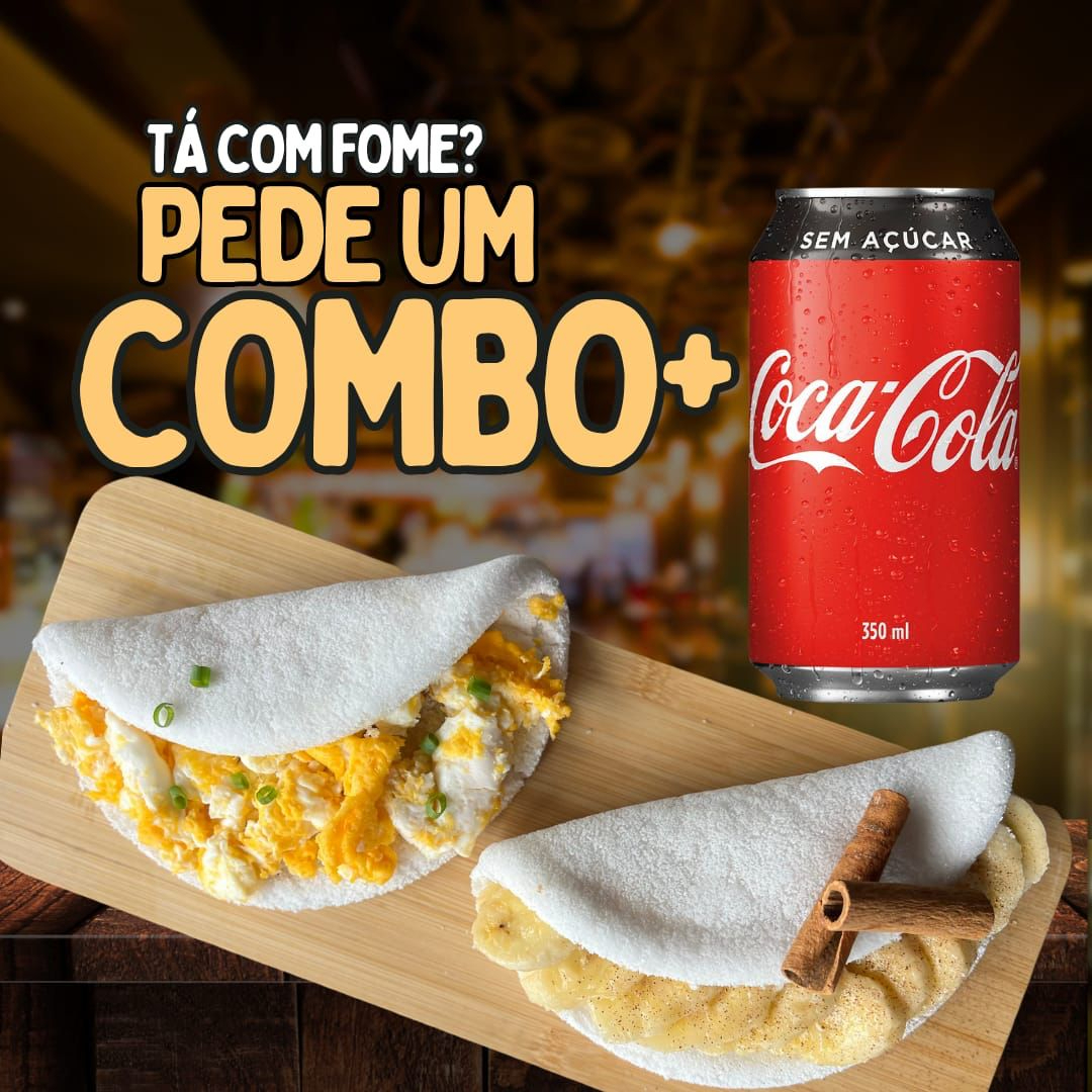 Inclui uma deliciosa tapioca de frango com Catupiry®️ original, super cremosa, uma tapioca doce de coco com leite condensado, e para completar, uma Coca-Cola 350ml bem gelada