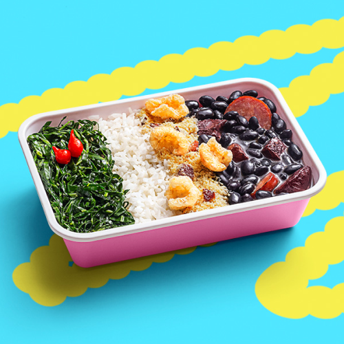 Feijoada Mita, com aquela farofinha de bacon especial e arroz branco bem soltinho. Também acompanha couve refogada, pimenta-biquinho e pururuca. Sabe aquela feijoada com gostinho de casa? Só vem!