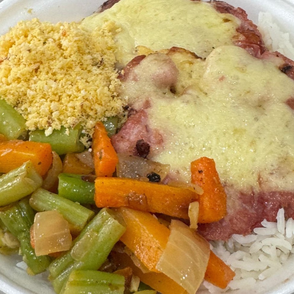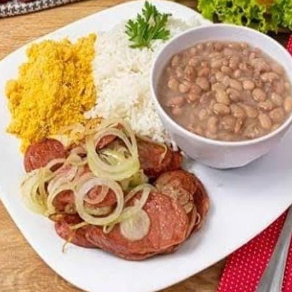 Calabresa acebolada no ponto certo, douradinha e cheia de sabor, servida com arroz branco soltinho, feijão caseiro e farofa crocante. Uma opção prática e deliciosa para o seu Dia a Dia, com o sabor que todo mundo ama! Complete sua refeição com nossos adicionais de salada fresca, legumes refogados ou maionese de batata.