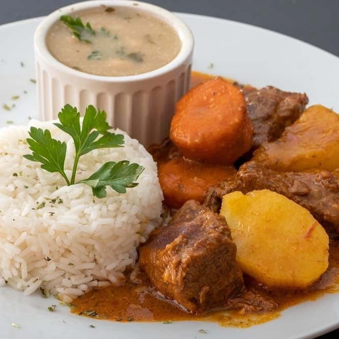 Carne de acém cozida lentamente com batata e cenoura, bem temperada e macia, acompanhada de arroz soltinho, feijão caseiro e farofa crocante. Uma refeição com sabor de comida da roça, ideal para o seu almoço ou jantar! Adicione ainda salada fresca, legumes refogados ou maionese de batata para uma marmita ainda mais completa.