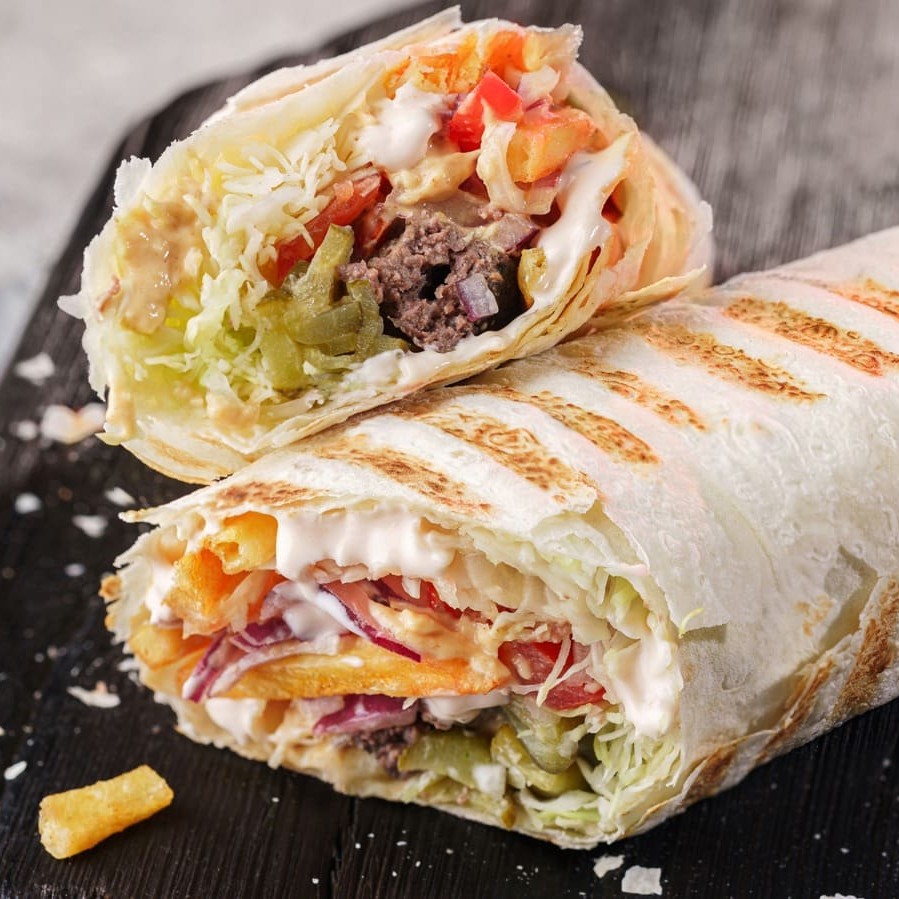 Estupendo lanche árabe recheado com uma saborosa carne de coxão mole cuidadosamente fatiada e temperada a moda turca com salada finamente fatiada de tomate, alface e cenoura que leva um fino molho de tahine. Para quem gosta de uma refeição rápida e equilibrada.