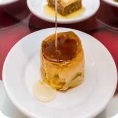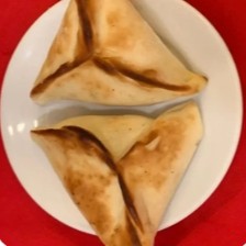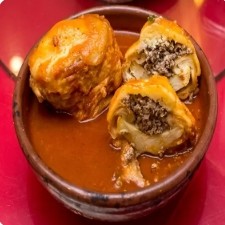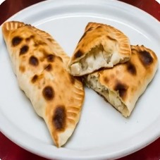 Massa de batata e trigo, recheada com cebola frita, hortelã, salsinha e castanha, sem carne