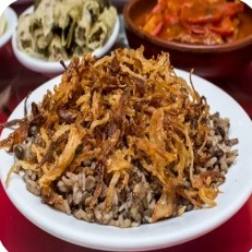 Arroz com lentilhas coberto com cebolas fritas