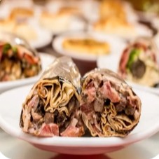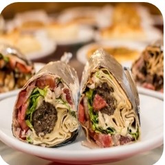 Kafta, alface, tomate, cebola com babaganouch enrolados no pão sírio