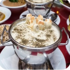 Pequenos capeletes recheados com carne e salsinha, cozidos na coalhada temperada