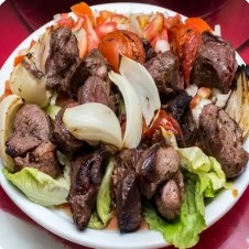 Servida grelhada no espeto. Acompanha arroz com carne bovina moída e castanhas ou arroz com aletria