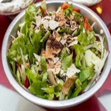 Salada preparada com alface, tomate, cebola, pepino, pimentão, rabanete, hortelã, salsinha, pão sírio torrado e summak