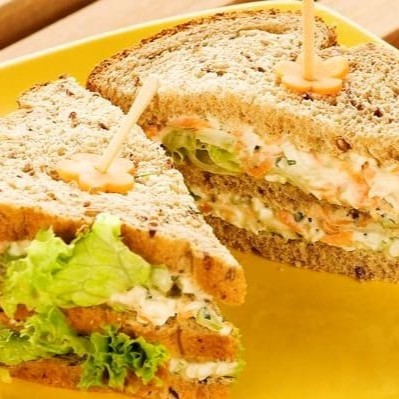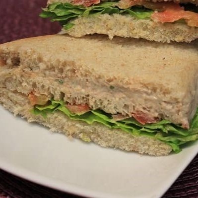 Pasta de atum, azeitonas verdes, cebola, alface, tomate e maionese no pão de forma integral.