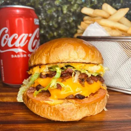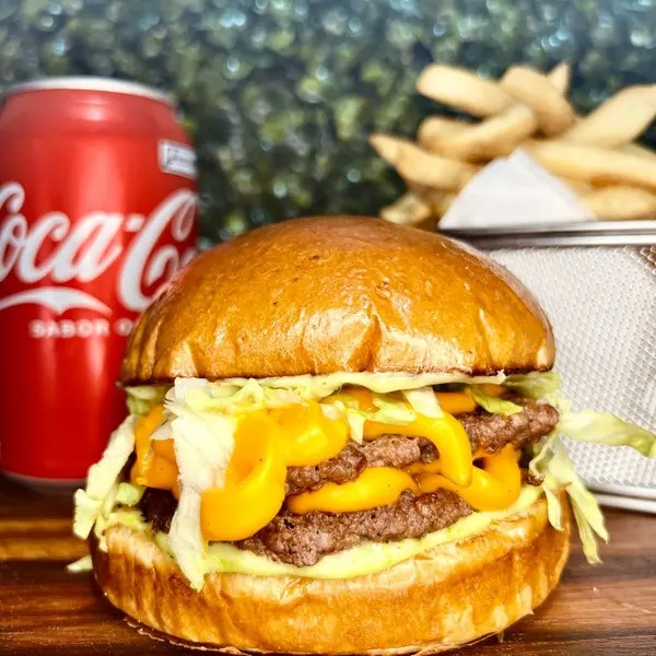 Pão brioche, 2 hamburguer 70gr, molho verde, alface, american cheese (bisnaga), batata p e refri p.