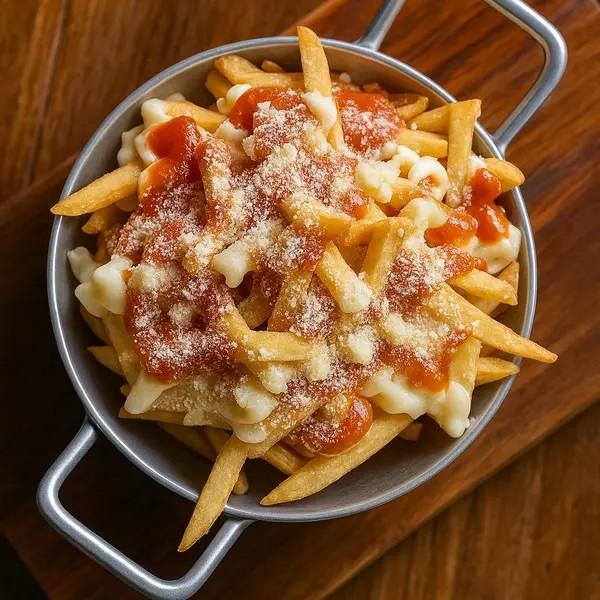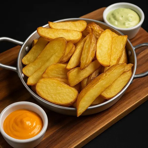 Batata P, maionese, ketchup e queijo ralado.