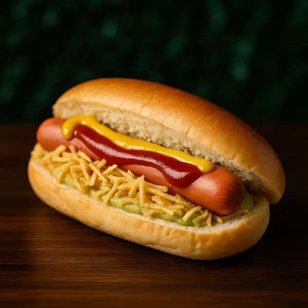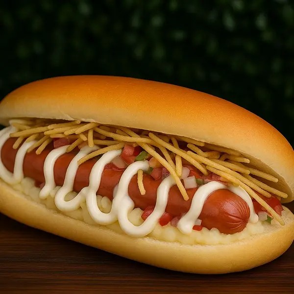 Pão 65g, 1 salsicha, purê, maionese verde, batata palha, ketchup e mostarda