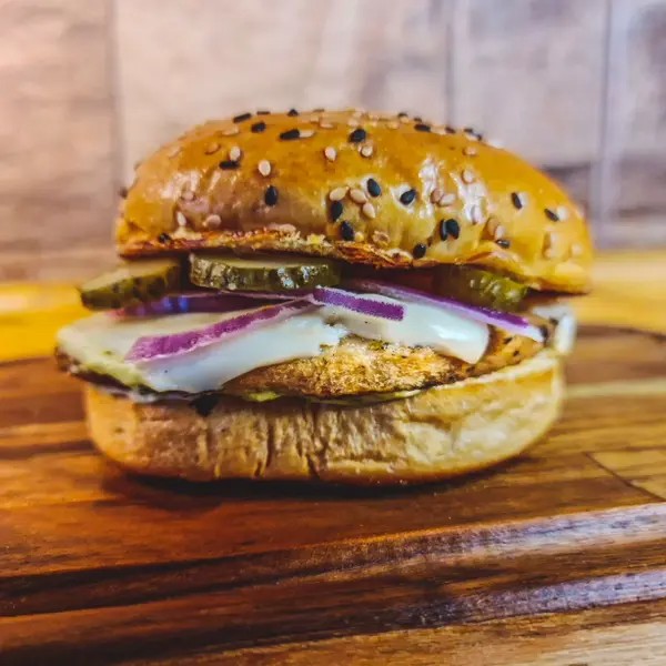 Pão de Gergelim, hambúrguer artesanal de frango 150 gramas, cebola, tomate, rucula, muçarela, requeijão cremoso e molho texas.