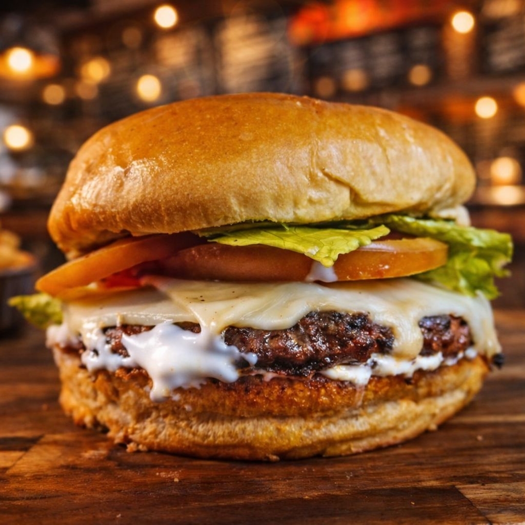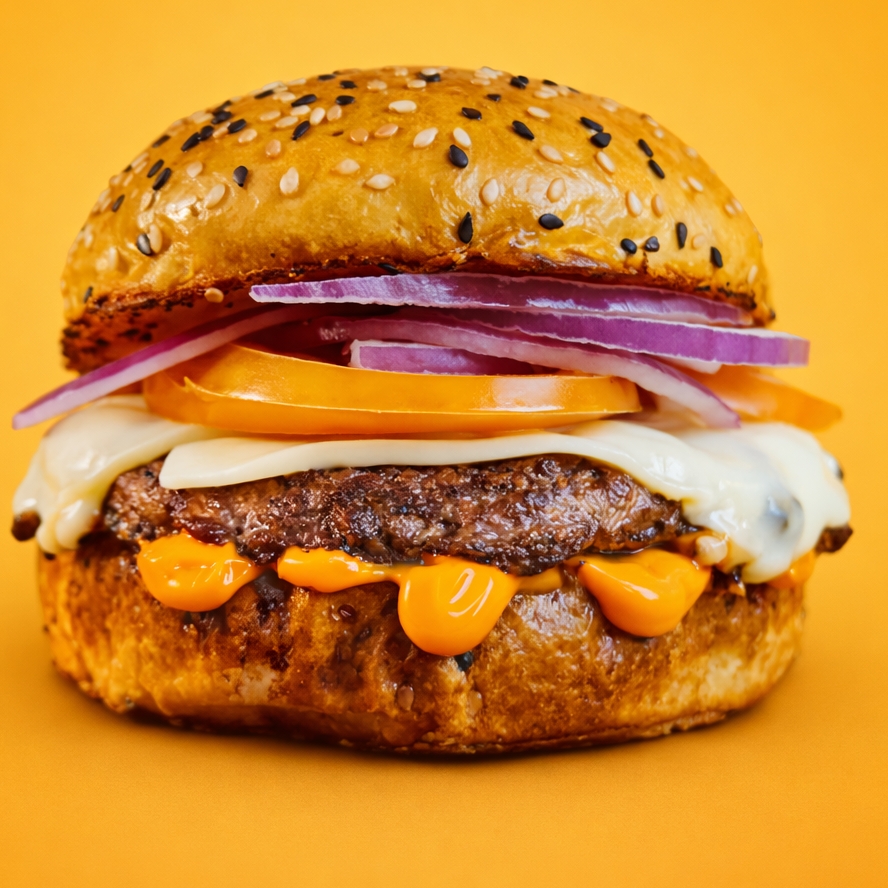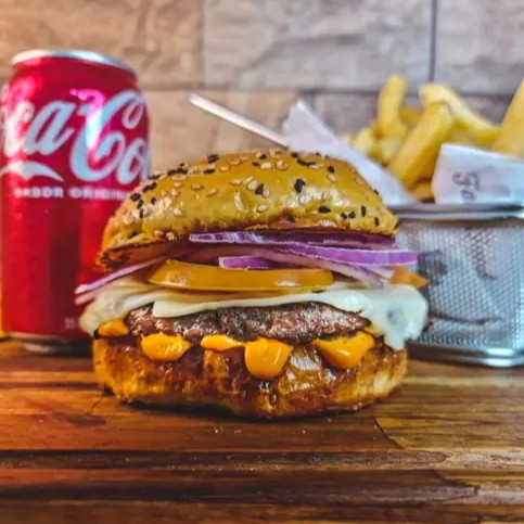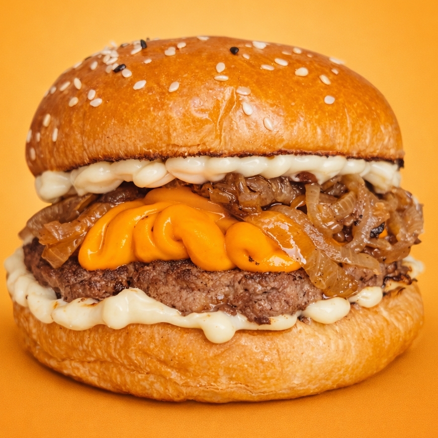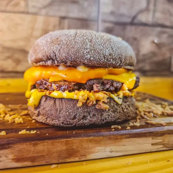 Pão de gergelim, maionese, hambúrguer 150g, molho cheddar defumado e cebola chapeada.