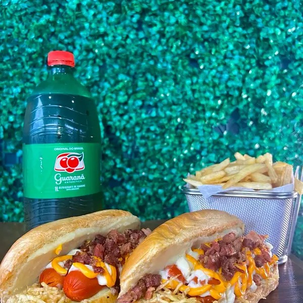 Pão 65g, 2 salsichas, purê, maionese verde, batata palha, bacon, requeijão cremoso, cheddar + batata p + 2 guarana 350ml
