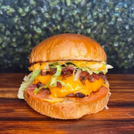 Pão brioche, Hamburguer 70gr, cheddar, bacon, alface, tomate e molho american.