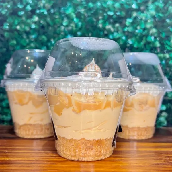 Farofinha de bolacha amanteigada, mousse de doce de leite, doce de leite caseiro, banana prata, chantilly cremoso finalizado com canela.