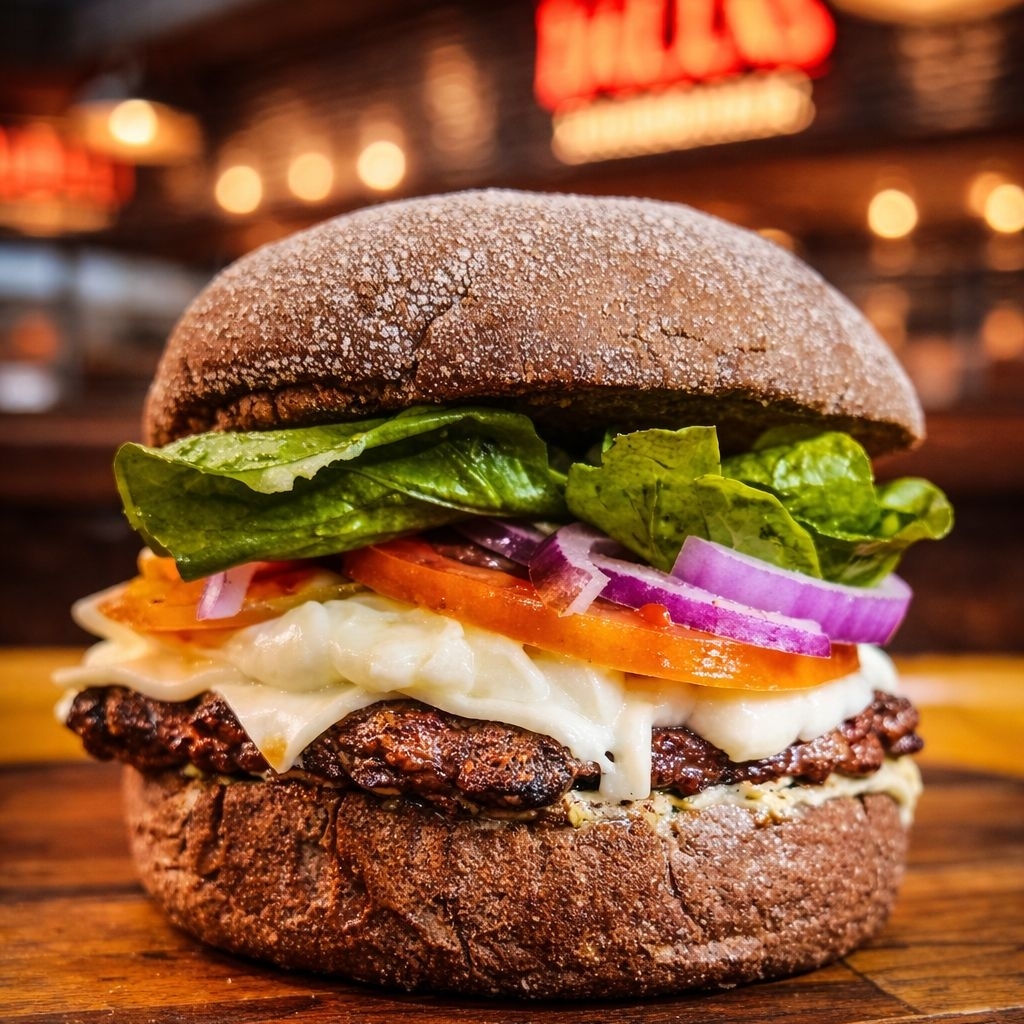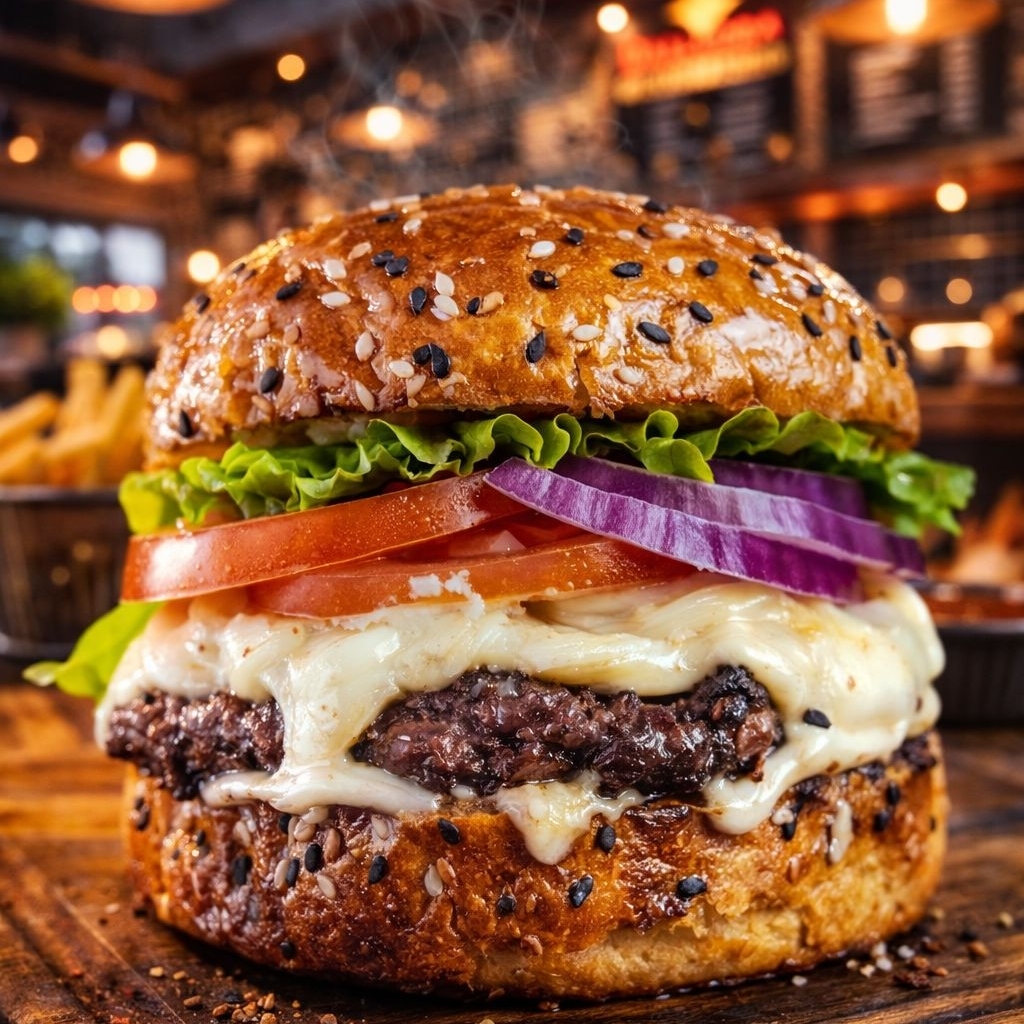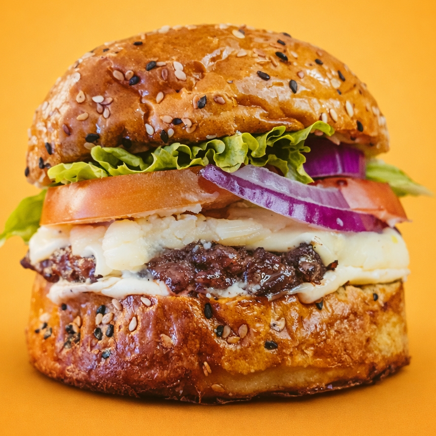 Pão australiano, hambúrguer 150g, queijo tipo 4 queijos, rúcula, tomate cebola roxa e molho especial