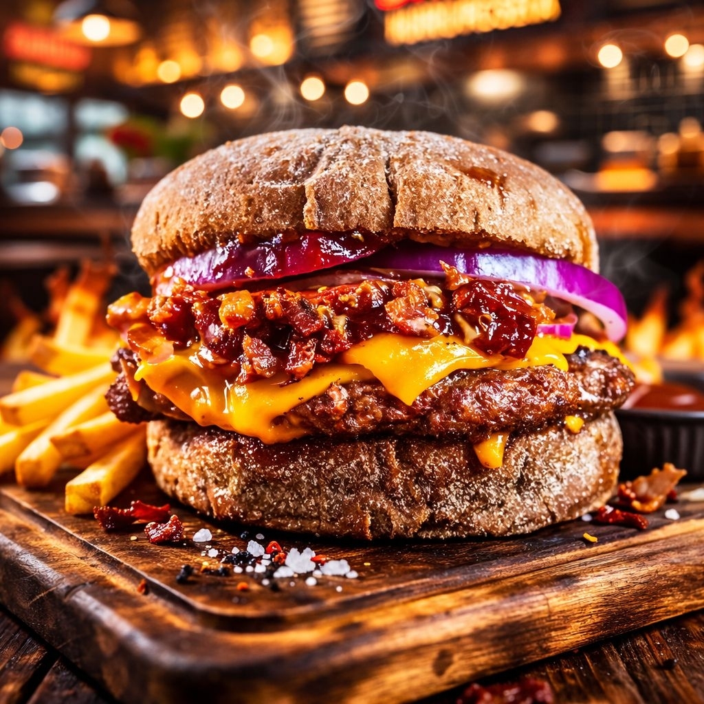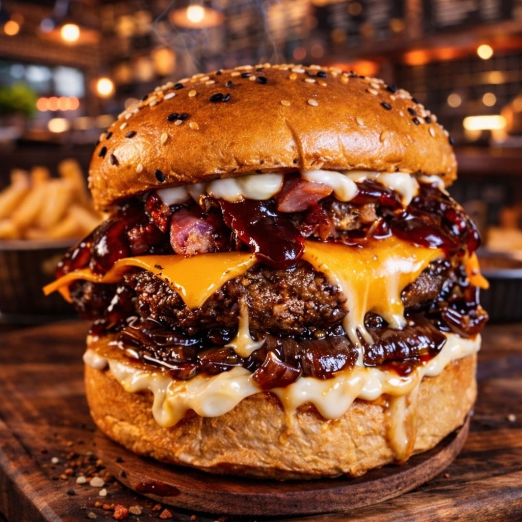Pão de gergelim mesclado, hambúrguer 170g, cheddar, cebola caramelizada, bacon, maionese e barbecue.