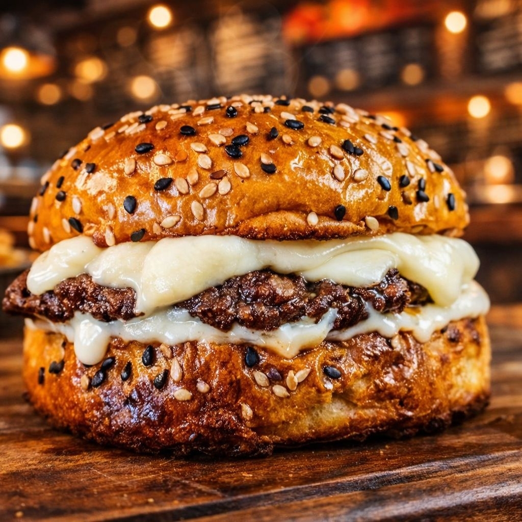 Pão de Gergelim, hamburguer 100g, maionese, mussarela, requeijão cremoso.