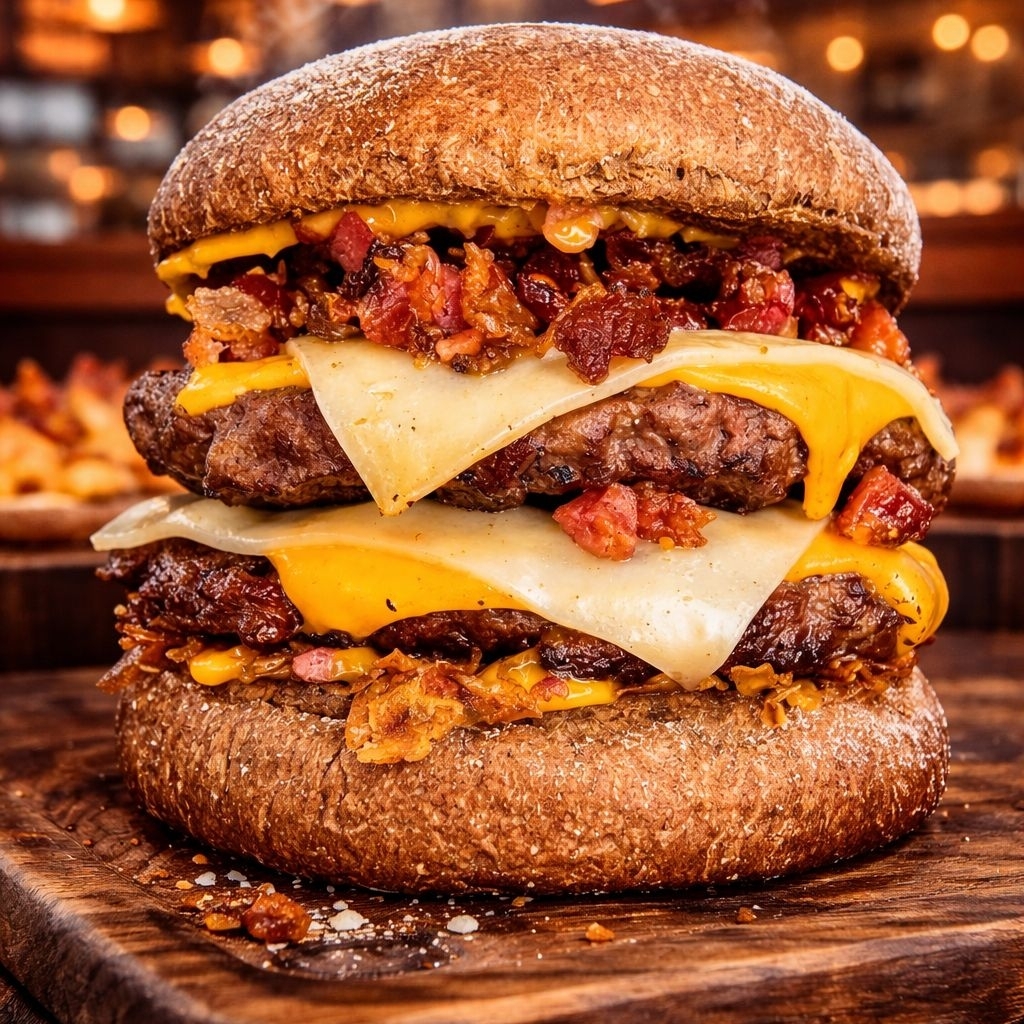 Pão australiano, 2 hamburguer 150 gr, bacon, cheddar, mussarela, molho especial e cebola crispy (crocante).