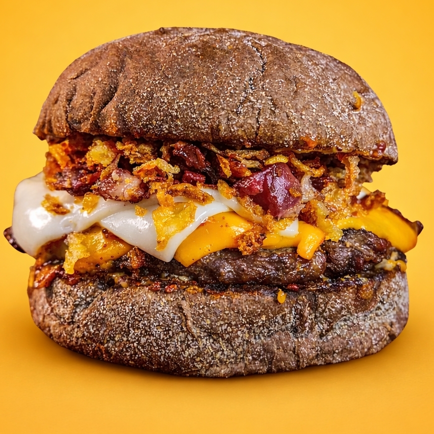 Pão australiano, hambúrguer 150g, cebola crispy, bacon, cheddar, mussarela e molho especial